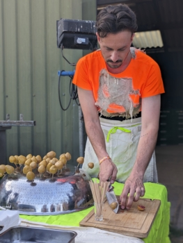 Two intimate public tasting moments added another layer. Twenty-five participants joined each ticketed tasting lecture as Pánči performed live with the traditional koncovka flute while Koronczi served archival fruit-vinegars, sea-lavender kimchi (foraged during his residency) and freshly fried lángoš — turning the installation into a guided, sensory lecture on salt, soil and care.